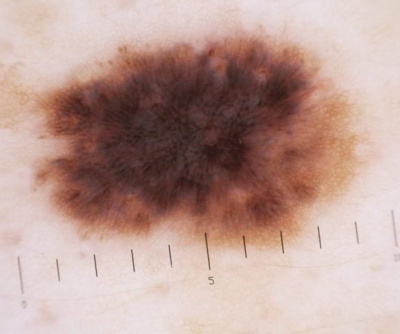 Close-up of a dysplastic naevus, highlighting its irregular shape, blurred border, and variation in colour.