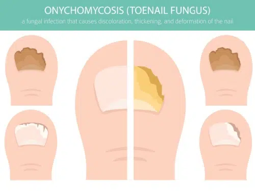 A fungal toenail infection, also known as onychomycosis, develops when microscopic fungal organisms invade the nail plate, nail bed, or surrounding tissue. These organisms feed on keratin, the protein that makes up the nail, causing the nail to weaken and change in appearance.